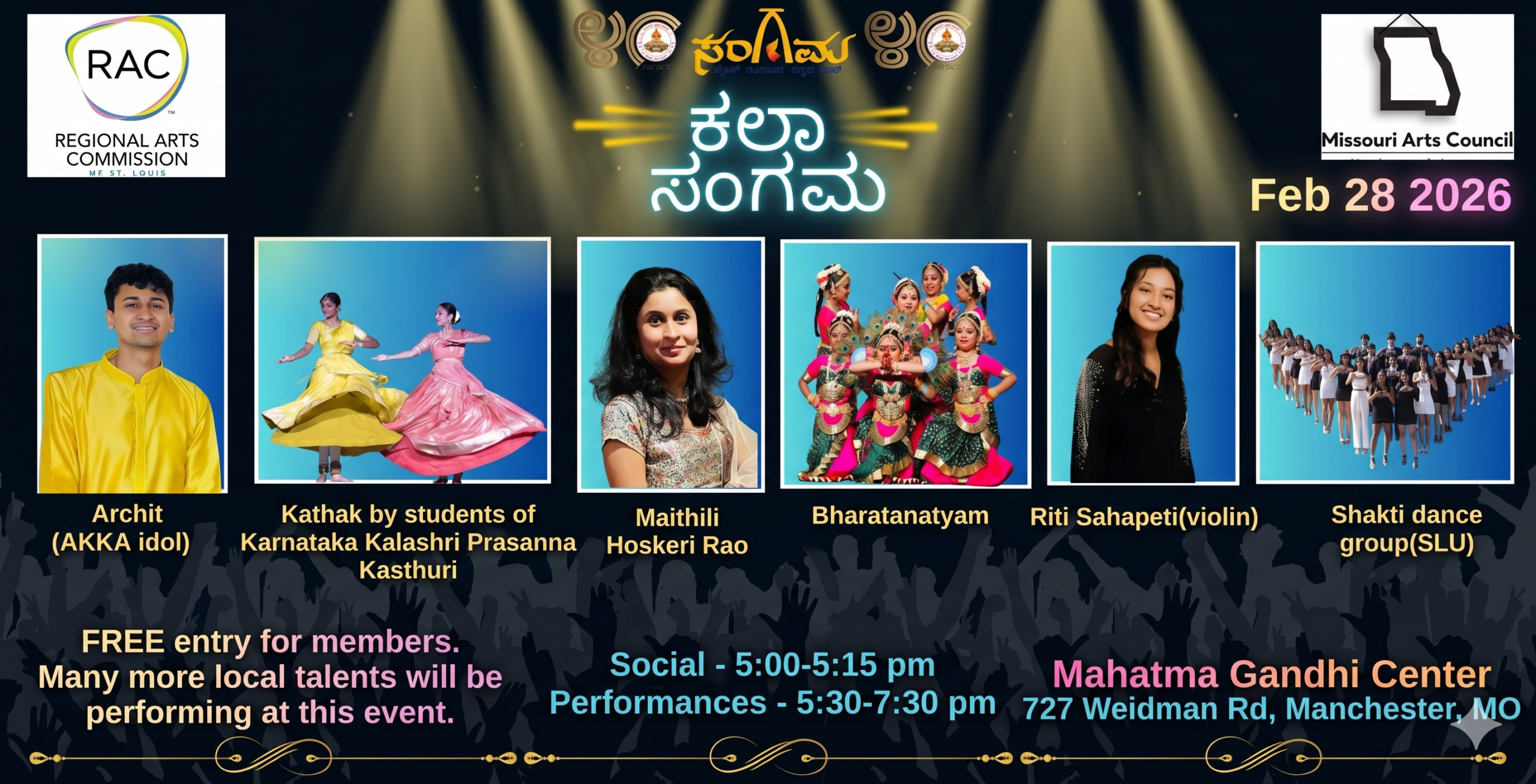 ಈ ವರ್ಷ ಸಂಗಮದ 41 ನೇ ವಾರ್ಷಿಕೋತ್ಸವ. ನಮ್ಮ ರೋಮಾಂಚಕ ಸಾಂಸ್ಕೃತಿಕ ಪರಂಪರೆಯನ್ನು ಆನಂದಿಸಲು ನಿಮ್ಮೆಲ್ಲರನ್ನೂ ಸೇಂಟ್ ಲೂಯಿಸ್ಗೆ ಆಹ್ವಾನಿಸುವ ಮೂಲಕ ನಾವು ಈ ಮೈಲಿಗಲ್ಲು ಕಾರ್ಯಕ್ರಮವನ್ನು ಆಚರಿಸಲು ಬಯಸುತ್ತೇವೆ. ಕಳೆದ ಈ 41 ವಸಂತಗಳು ನಮಗೆ ಇನ್ನಷ್ಟು ಹೆಚ್ಚು ಸಾಧನೆ ಮಾಡಲು ಸ್ಪೂರ್ತಿಯಾಗಿದೆ. ಈ ಹರ್ಷವನ್ನು ನಿಮ್ಮೆಲ್ಲರ ಜೊತೆಯಲ್ಲಿ ಹಂಚಿಕೊಳ್ಳಲು ಹಾಗು ನಮ್ಮ ಈ ಸುದೀರ್ಘ ಪ್ರಯಾಣದ ಹಲವು ಸುಂದರ ಕ್ಷಣಗಳನ್ನು ಮೆಲುಕು ಹಾಕಲು, ನೀವೆಲ್ಲರೂ ಬಂದು ಭಾಗವಹಿಸಿದರೆ ಅದಕ್ಕಿಂತ ಮಿಗಿಲಾದ ಸಾರ್ಥಕ ಭಾವ ಮತ್ತೊಂದಿಲ್ಲ. ಬನ್ನಿ ನಮ್ಮ ಈ ಸಂತೋಷದಲ್ಲಿ ನೀವು ಭಾಗಿಯಾಗಿ ಹಾಗು ನಮ್ಮನ್ನು ಹರಸಿ.